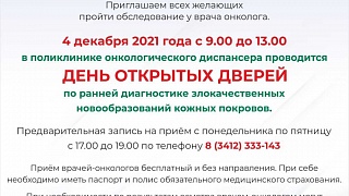4 декабря 2021 года с 9.00 до 13.00 в поликлинике онкологического диспансера проводится ДЕНЬ ОТКРЫТЫХ ДВЕРЕЙ по ранней диагностике злокачественных новообразований кожных покровов