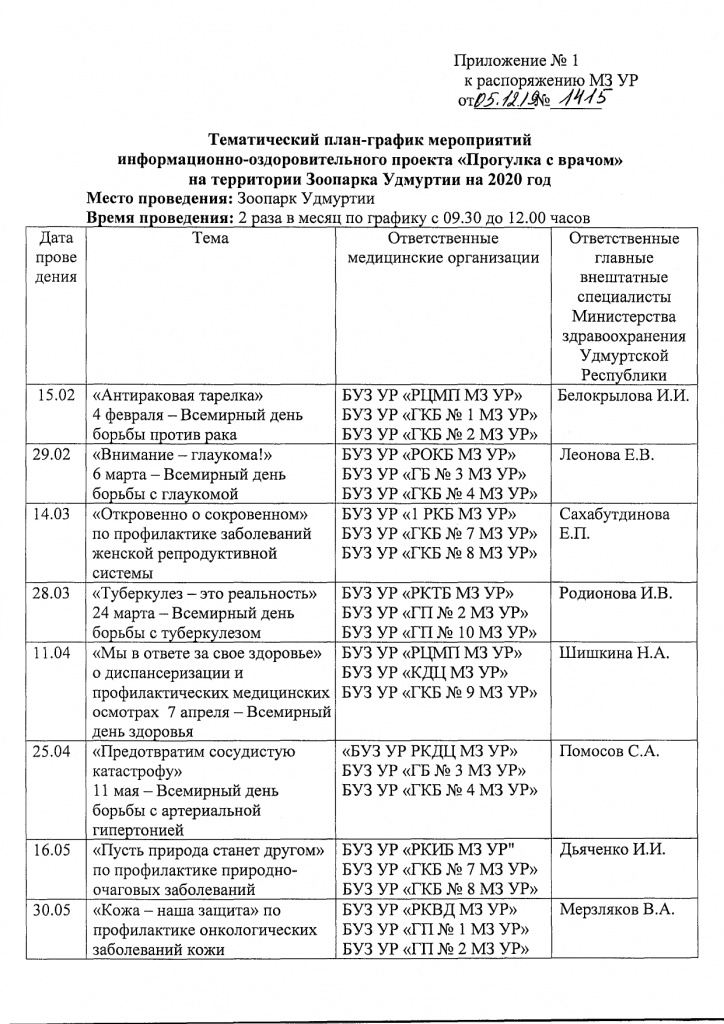 Мероприятия проекта проходят по графику по субботам: в зоопарке два раза в месяц, в Устиновском районе – один раз в месяц. Темы Прогулок определяются на весь год и утверждаются распоряжениями Министерства здравоохранения Удмуртской Республики.